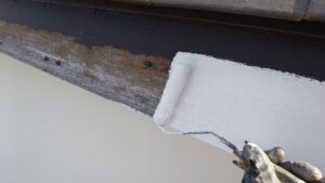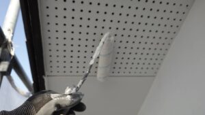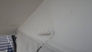 昨日下塗りをした軒天と漆喰部分の上塗り
