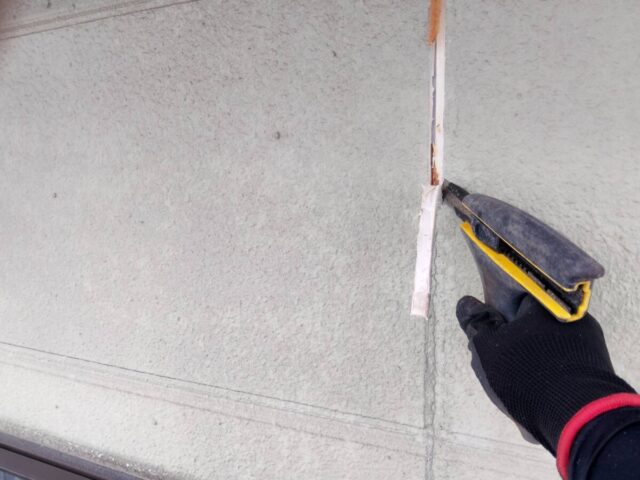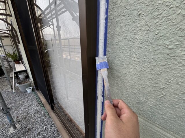 劣化してひび割れが起きていた古いコーキングは撤去して、新しいコーキング材を打ち込んでいきます。