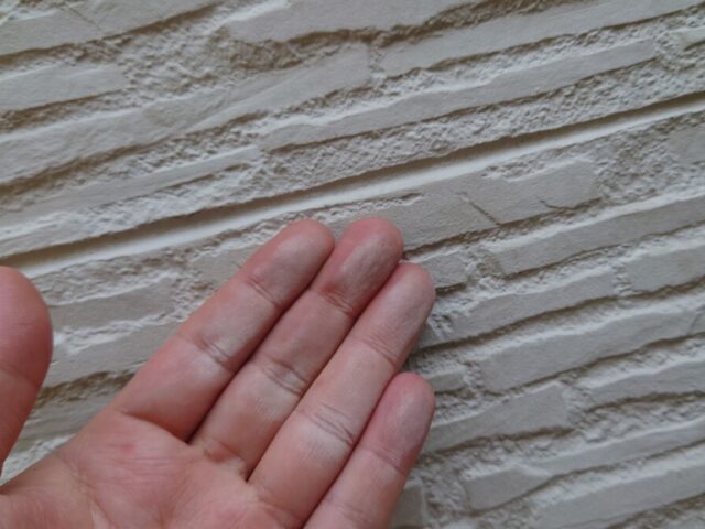 K様のおっしゃるとおり、外壁は剥がれや色褪せがだいぶ進んでしまっていて、塗り替えの目安とされるチョーキング現象も確認できました。