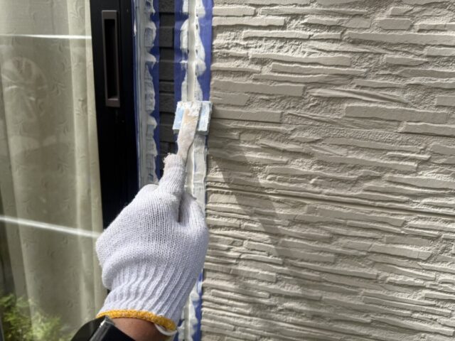 劣化したコーキングの写真と、新しいコーキングを打ち込み、均している写真です。